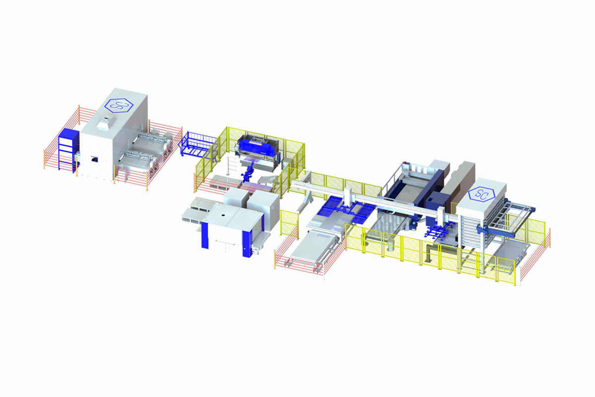 全自動鈑金柔性加工生產(chǎn)線,將現(xiàn)在傳統(tǒng)的三大件(剪、沖、折)加上激光切割有機的結(jié)合為一體,從金屬材料的進料、傳送、堆放和卸料全部實現(xiàn)自動化,充分保證了鈑金加工的高質(zhì)量、高效率和節(jié)約了人力資源。