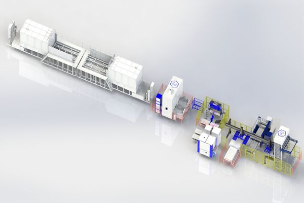 巖棉自動(dòng)復(fù)合生產(chǎn)線,可以自動(dòng)鋪設(shè),并針對(duì)三層夾芯板進(jìn)行無污染涂膠。自動(dòng)化與環(huán)保兼得。